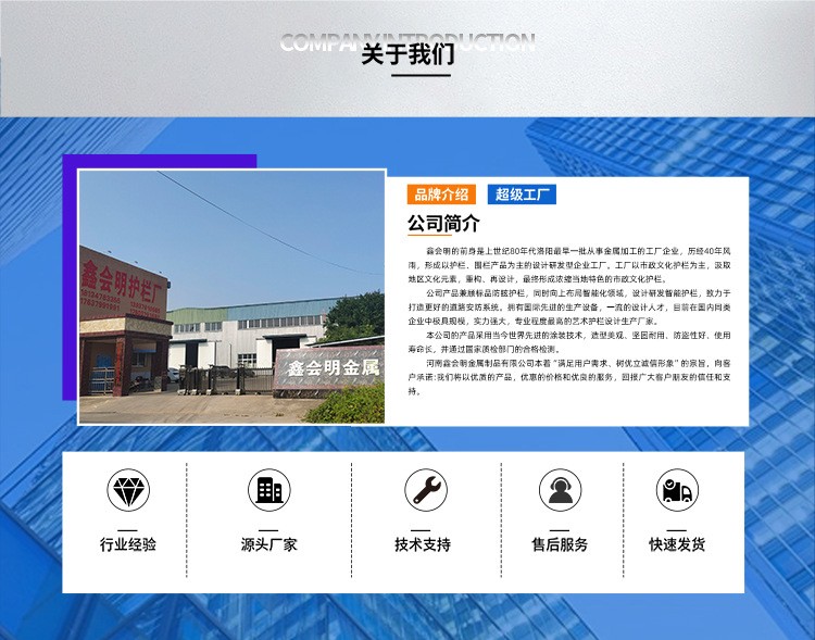 專注從事市政護欄系列、陽臺護欄系列、百葉窗系列、圍墻護欄系列、橋梁護欄系列、臨時圍擋系列、鋅鋼大門系列、涼亭系列等產(chǎn)品